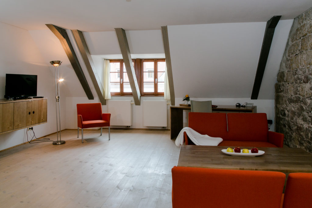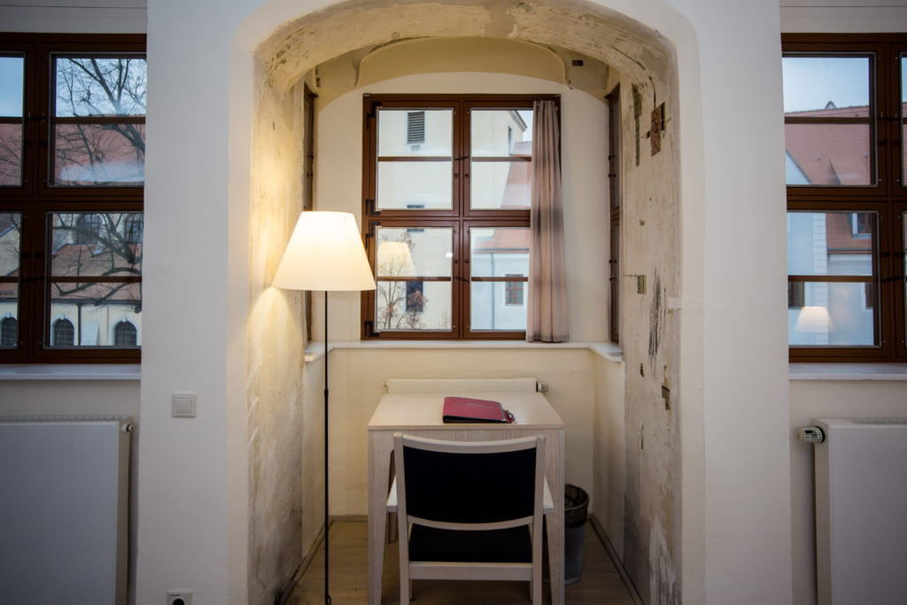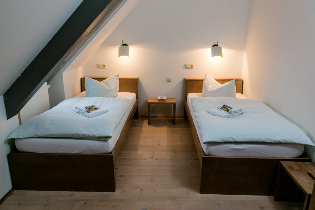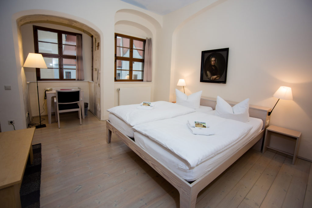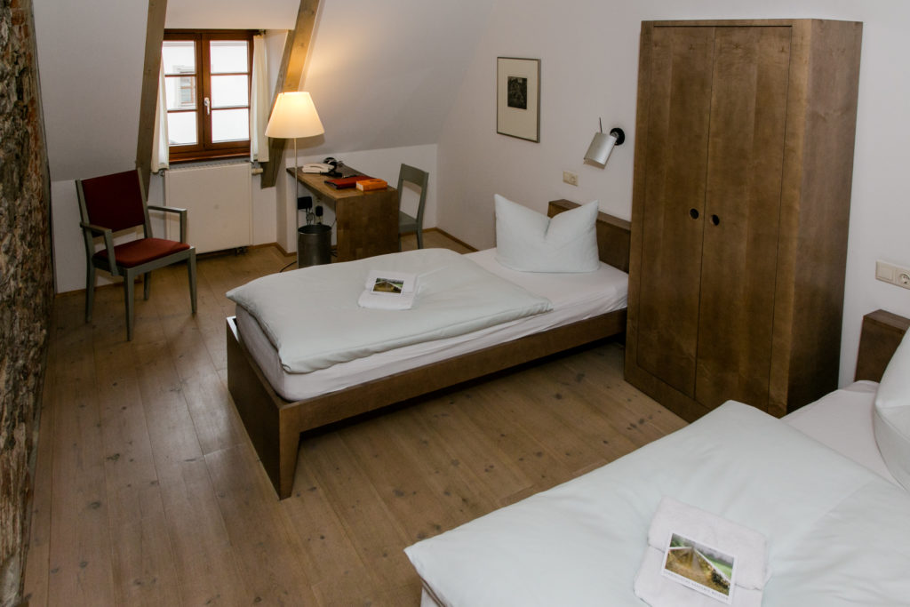 Unsere Gäste wohnen in Zimmern von schlichter Eleganz, die von der Einrichtung und mit den Holzfußböden noch die Mönchszellen des alten Klosters erahnen lassen. Ruhe und Erholung genießen Sie heute mit modernem Komfort.